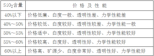 目前我國(guó)探明的滑石粉主要分布在廣西桂林一帶、山東棲霞、萊州膠東半島、遼寧海城地區(qū)等。由于礦源不同,滑石的性能結(jié)構(gòu)不同,經(jīng)過對(duì)比應(yīng)用試驗(yàn),廣西的滑石透明性好,加工性能優(yōu)異。山東膠州半島的滑石粉SiO2含量較低,白度好,但透明性差。遼寧海城的滑石粉礦產(chǎn)資源豐富,價(jià)格適中,品種較多。但滑石粉的品種很多,礦源不同,加工技術(shù)也有差異,在選擇滑石粉時(shí)一定要根據(jù)用途不同,選擇不同規(guī)格、不同指標(biāo)的滑石粉?;壑械?/span>SiO2含量對(duì)滑石粉的性能有影響(見下表)。