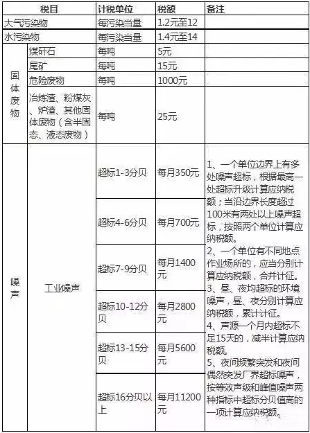 大氣污染物稅額幅度為每污染當(dāng)量1.2元-12元;水污染物稅額幅度為每污染當(dāng)量1.4元-14元;固體廢物按不同種類(lèi),稅額為每噸5元-1000元;噪聲按超標(biāo)分貝數(shù),稅額為每月350元-11200元。