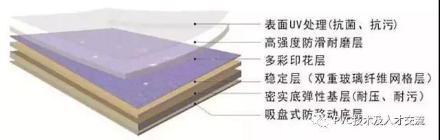 多層復合型PVC地板:有多層結構的地板,一般由4~5層結構疊壓而成,一般有耐磨層(含UV處理)、印花膜層、玻璃纖維層、彈性發(fā)泡層、基層等。