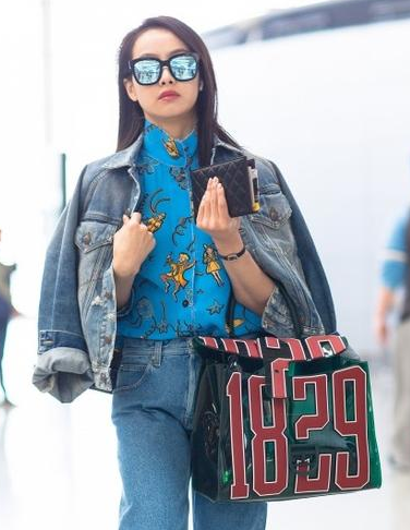 宋茜戴Gentle Monster藍(lán)色鏡面墨鏡,身穿藍(lán)色破洞牛仔夾克,內(nèi)搭藍(lán)色印花雪紡襯衫,手拎Delvaux墨綠色數(shù)字拼貼透明手袋,下穿藍(lán)色皮質(zhì)拼接牛仔褲,腳踩Converse白色帆布鞋。純透明的單品會(huì)讓部分人覺(jué)得過(guò)于暴露自己隱私,所以選擇印花透視的PVC既有隱約的神秘感,又可展現(xiàn)時(shí)髦感。