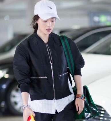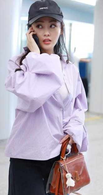 張?zhí)鞇?ài)頭戴黑色字母刺繡棒球帽,身穿淺紫色oversized豎條紋長(zhǎng)袖襯衫,內(nèi)搭白色背心,手拎棕色外套透明pvc保護(hù)膜Valextra手拎包,下穿Re/done黑色毛邊牛仔半裙,腳踩Hogan古銅色漆皮休閑系帶運(yùn)動(dòng)鞋。