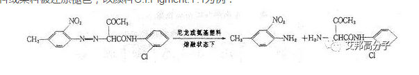 某些高聚物,如尼龍和氨基塑料在熔融狀態(tài)下,是很強(qiáng)的酸性還原劑,它們能使在加工溫度下很穩(wěn)定的顏料或染料被還原褪色,以顏料C.I.Pigment.Y.1為例: