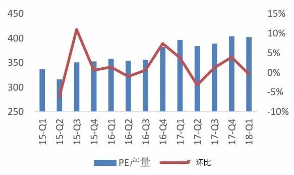數(shù)據(jù)顯示,中國(guó)聚乙烯進(jìn)口依存度在40-45%左右,進(jìn)口依賴度較高。2018年1月份聚乙烯進(jìn)口128.9萬(wàn)噸,環(huán)比增加17%。2月份由于春節(jié)假期因素進(jìn)口量下降明顯,但3月份從遠(yuǎn)洋貨物的到港情況來(lái)看,進(jìn)口量仍存較高預(yù)期。