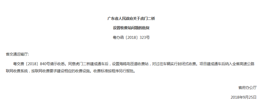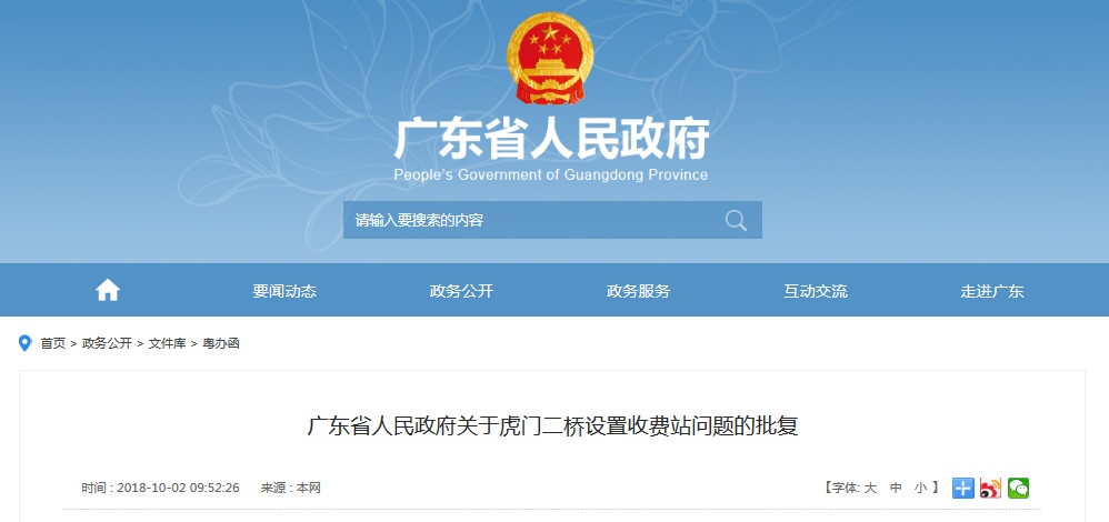 10月2日,即在國(guó)慶節(jié)假日期間,廣東省人民政府門戶網(wǎng)站加班加點(diǎn)發(fā)布重磅公告,即有關(guān)虎門二橋設(shè)置收費(fèi)站問題已獲省府批復(fù),為明年虎門二橋的開通前期準(zhǔn)備工作全面加速同步推進(jìn),預(yù)計(jì)虎門二橋?qū)⒂诿髂晟习肽杲ǔ赏ㄜ?,通車后打通珠江兩岸交通瓶頸,極大緩解目前虎門大橋的擁堵狀況。