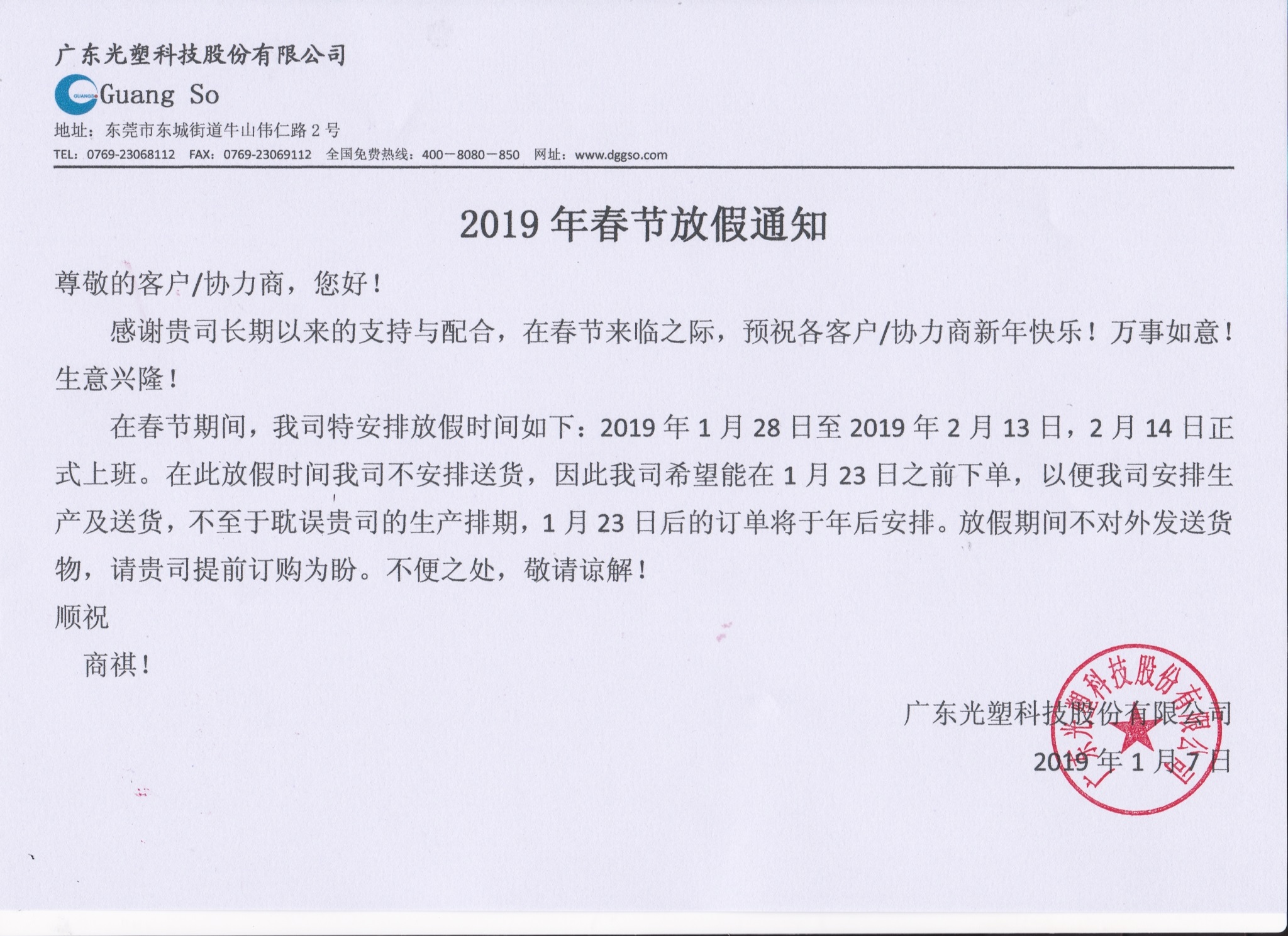 尊敬的客戶(hù)/協(xié)力商,您好!感謝貴司長(zhǎng)期以來(lái)的支持與配合,在春節(jié)來(lái)臨之際,預(yù)祝各客戶(hù)/協(xié)力商新年快樂(lè)!萬(wàn)事如意!生意興隆!在春節(jié)期間,我司特安排放假時(shí)間如下:2019年1月28日至2019年2月13日,2月14日正式上班。在此放假時(shí)間我司不安排送貨,因此我司希望能在1月23日之前下單,以便我司安排生產(chǎn)及送貨,不至于耽誤貴司的生產(chǎn)排期,1月23日后的訂單將于年后安排。放假期間不對(duì)外發(fā)送貨物,請(qǐng)貴司提前訂購(gòu)為盼。不便之處,敬請(qǐng)諒解!