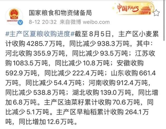 隨著央視抨擊吃播浪費(fèi)的現(xiàn)象以及聯(lián)合國發(fā)布的饑餓問題后,糧食危機(jī)一時(shí)間飚上各大新聞版塊。8月12日,國家糧食和物資儲(chǔ)備局發(fā)布今年夏糧的收購情況:截止8月5日,主產(chǎn)區(qū)小麥累計(jì)收購4285.97萬噸,同比減少938.3萬噸!驟減的數(shù)量,令國人心中一驚。